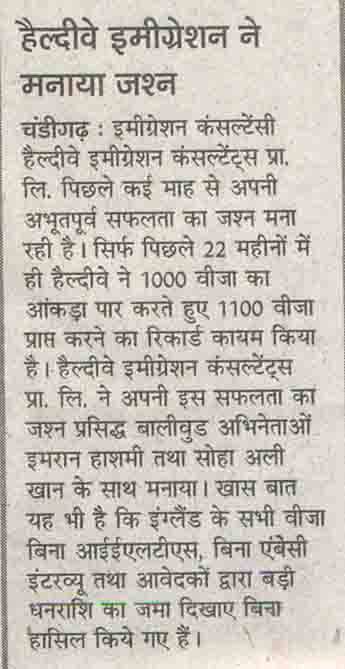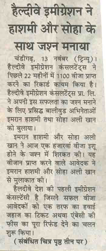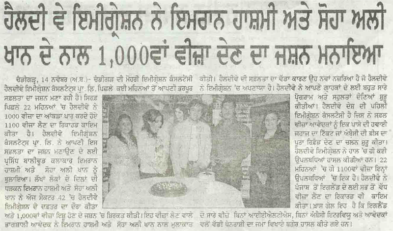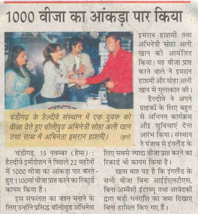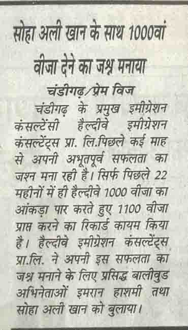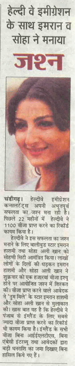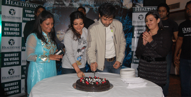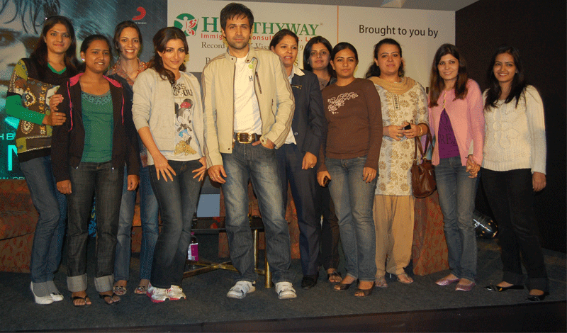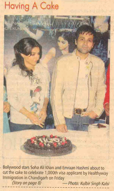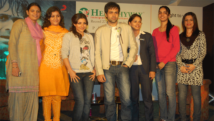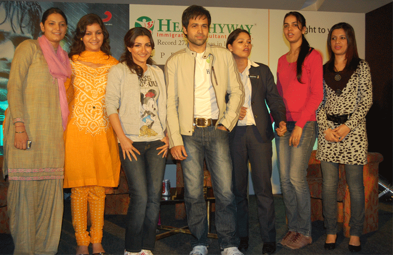 Healthyway Immigration Consultants Pvt Ltd, Chandigarh, celebrates its 1000 visas with Bollywood Heart throbs Soha Ali Khan and Emraan Hashmi at Hotel Mount View, Chandigarh. The lucky 1000th visa winner from Healthyway met face to face with both Emraan Hashmi and Soha Ali Khan and received the passport from them in a gala ceremony.