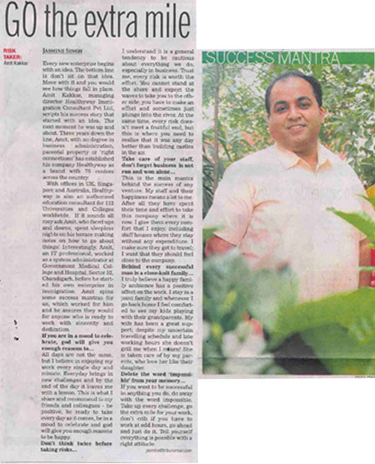 If you want to be successful in anything you do, delete the word 'impossible' from your dictionary. Take up every challenge, go the extra mile, go ahead and just do it! Tell yourself everything is possible with a right attitude. That's what Mr. Amit Kakkar, CEO of Healthyway Immigration Consultant advices every ambitious individual for sure success in life in one of his interview in The Tribune, Chandigarh.