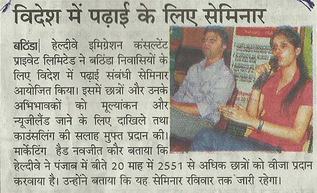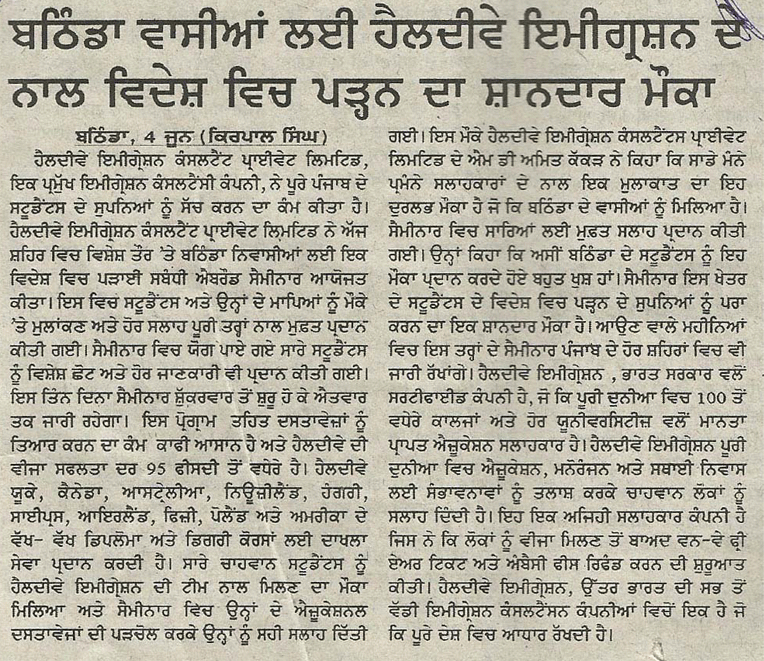 News paper clippings of Healthyway Immigration Free Mega seminar In Bathinda.