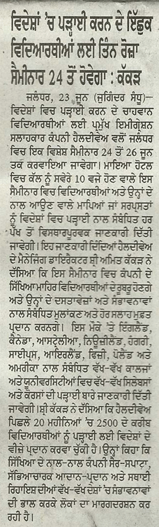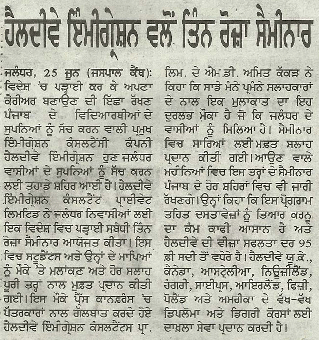 News paper clippings of Healthyway Immigration Free Mega seminar In Jalandhar.