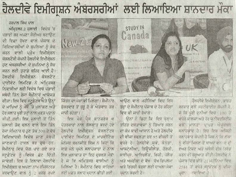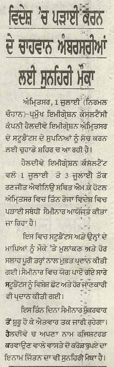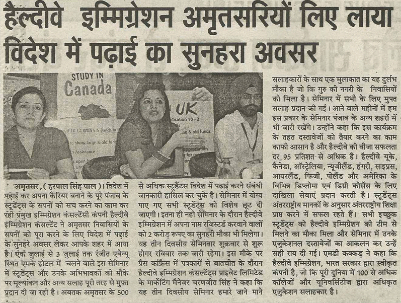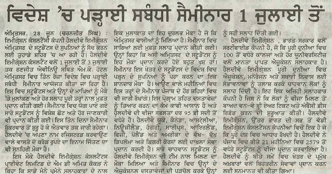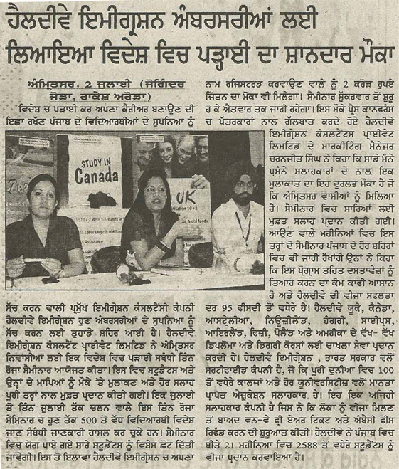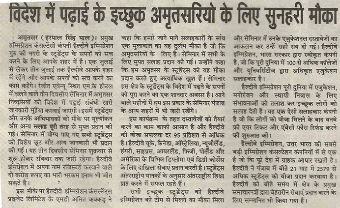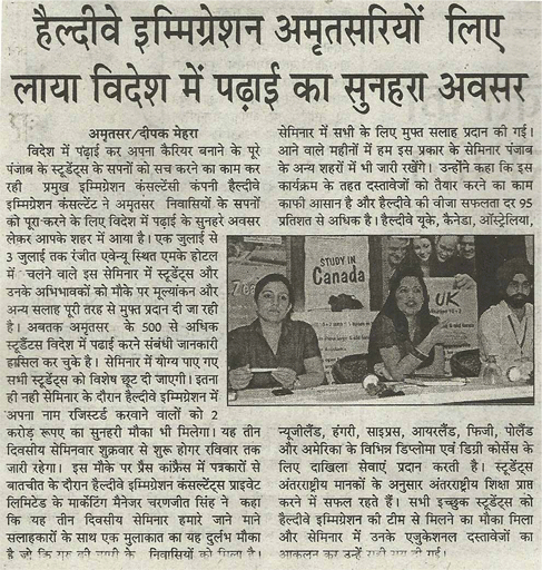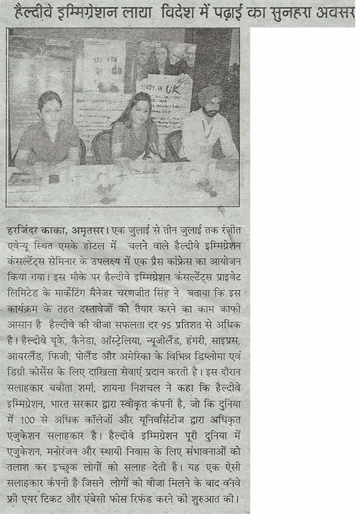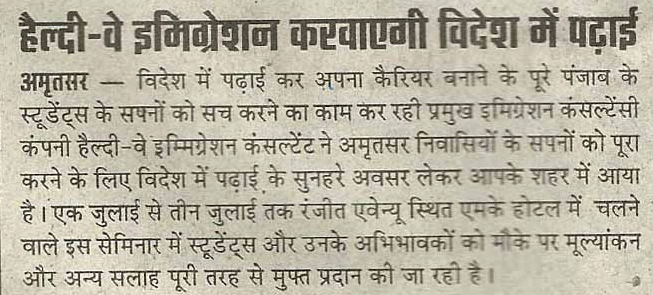News paper clippings of Healthyway Immigration Free Mega seminar In Amritsar.