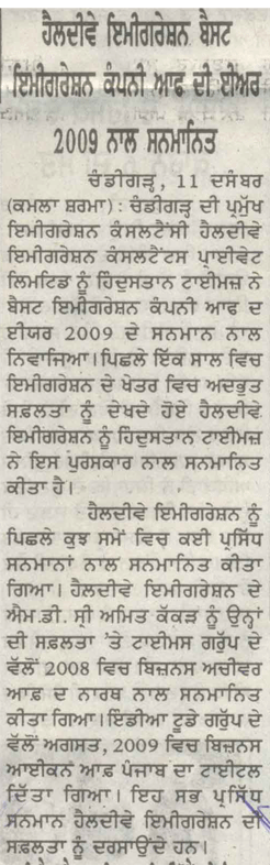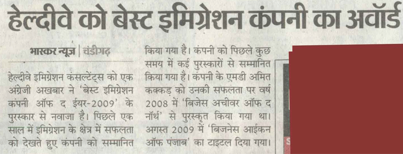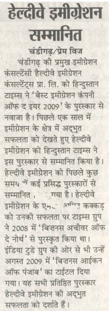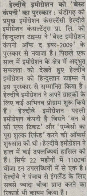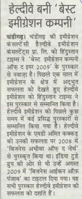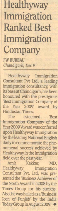 Healthyway Immigration Consultants Pvt Ltd, with its base at Chandigarh has been awarded as the 'Best Immigration Company of year 2009' by Hindustan Times. The esteemed 'Best Immigration Company of the year' Award was conferred upon Healthyway Immigration by the leading National English to commemorate the phenomenal success achieved by Healthyway in the Immigration field over the past year.